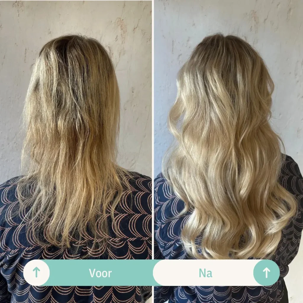 Voor en na met SISKO Hair-weaves, verzorgd met Ornatiq. Natuurlijk volume en glans die langdurig mooi blijft.